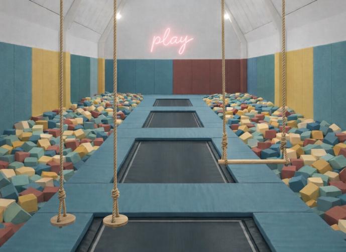 Outside, the plans propose a river facing terrace, climbing wall, a basketball court, a sociable table tennis corner, and a seasonal splash pad.
