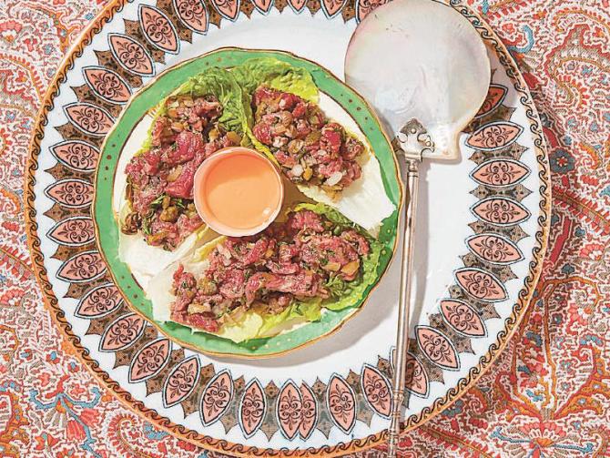2. If you are heading out on a hot day, you might not want to carry a bag full of raw meat, gently sweating in its own juices. On such a day, it’s a good idea to mix all the seasoning ingredients at home and take them with you in a little tub. While out and about, purchase your chosen piece of steak from a butcher, ask them to finely chop (never mince) the meat for you, and then mix the seasonings into the meat just before you eat. Either way, when the time comes, simply spoon the tartare into the lettuce cups and serve with the ‘optional’ extras alongside.