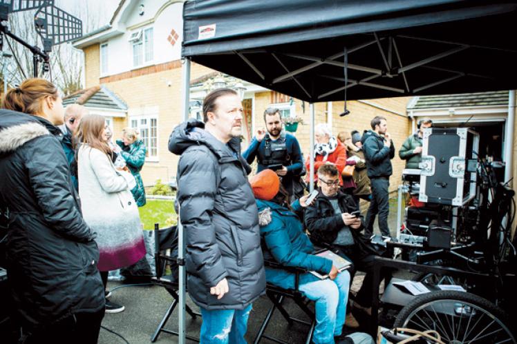 Screens under a black gazebo on the driveway and down the side of the house allowed producer Charlie Hanson – who worked on Extras and Derek – Gervais and a continuity supervisor to see how the scenes will play out on screen.