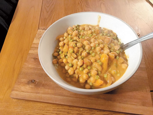 While a bit of fresh garlic, onion and ginger would have livened things up a bit, I managed to rustle up a hearty chickpea and vegetable curry, using tinned vegetable balti, peas and carrots in a can, coconut milk, tinned tomatoes and a hint of chili powder – assuming a foodbank user could have some knocking around.