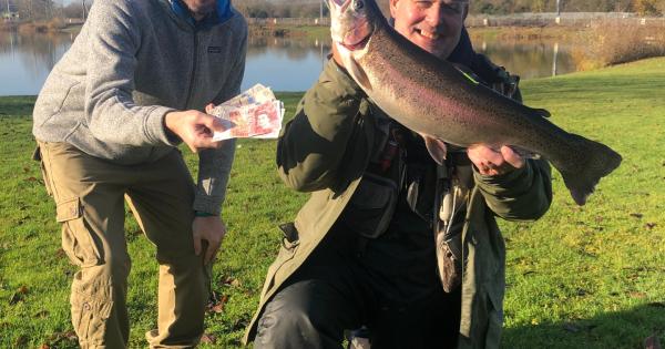 No double figure fish were reported, but there were a few 6lb plus fish showing with hothead damsel, cat‘s whiskers, blobs and buzzers all tempting fish. The most profitable result of the week, however, fell to Peter Martin who landed himself an early Christmas present by netting the prize tagged trout – a 9lb rainbow – and collecting a very nice £250 bonus. Peter is pictured here being presented with the cash by Sportfish team member, Nick Clewlow.