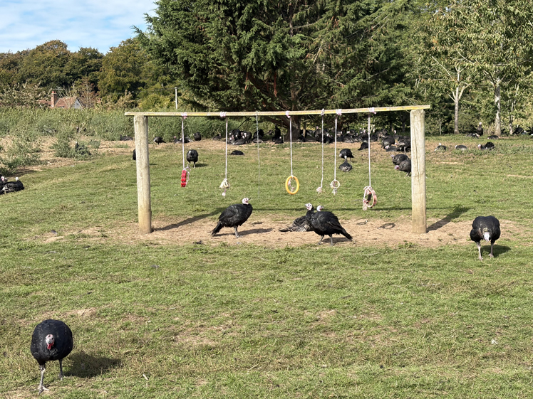 As the festive countdown continues, the sound of jingle bells can be heard across the fields – not from Santa’s sleigh, but from turkeys pecking away at tambourines and bells hung around their paddocks.