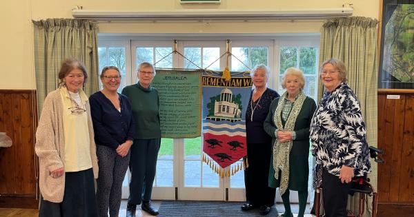 From left to right: Caroline Leeming, Frances Plowman, Rosemary Pratt, Daphne Austen, president of the Remenham WI branch, Margaret Spratley and Sue Sharp, with the Remenham WI standards