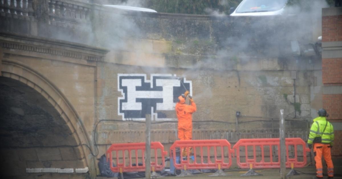 Contractors used a hot water pressure washer to remove the black and white “H” graffiti tag, which has been there for more than two years.