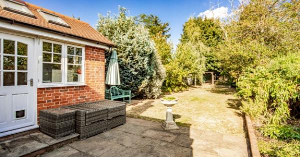 Step out from the family room and you’re on an expansive paved terrace made for long lunches; beyond, more than a hundred feet of lawn stretches away, edged by mature borders and trees, including a silver birch, and arranged with a dedicated play area and two good outbuildings (a larger workshop-style shed and a second for overflow storage).