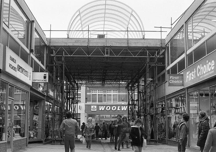1985: The barrel vaulted roof – a feature of the £2million Nicholsons Walk refurbishment scheme – emerged in skeleton form over the High Street entrance to the door precinct.