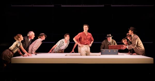 The production is by The Faction, an ensemble company that takes on classic texts in a highly original and theatrical way. Given the novel’s intense interiority, the ensemble approach is surprisingly effective and often funny. There was the bus to Rome scene, created with suitcases and the trilby-wearing chorus in a frieze, then a car created with the actors waist deep in the central pit, two lamps held at surface level.
